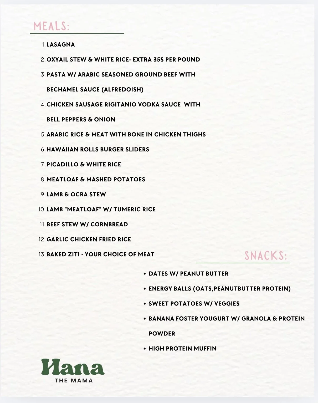 At Hana the Mama, every meal is thoughtfully prepared to bring comfort, nourishment, and ease to busy families — especially during pregnancy, postpartum, and the early parenting season when support matters most.